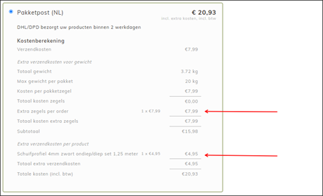 Informatie over ‘Extra Zegel’ en ‘Verpakkingskosten’ zijn te vinden bij het artikel onder de prijs (zie onderstaande voorbeelden). En of in de informatie tekst van het artikel.