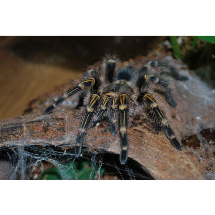 Nederlandse naam: Chaco goudknie vogelspin Wetenschappelijke naam: Grammostola pulchripes Grootte: Tot 12 cm Terrarium: 30x30x30 cm of groter Herkomst: Paraguay Biotoop: Tropisch regenwoud Lampen: Geen UV noodzakelijk Temperatuur: 25 tot 30 graden Voeding: Insecten Voortplanting: Eierleggend Leeftijd: Tot 20 jaar